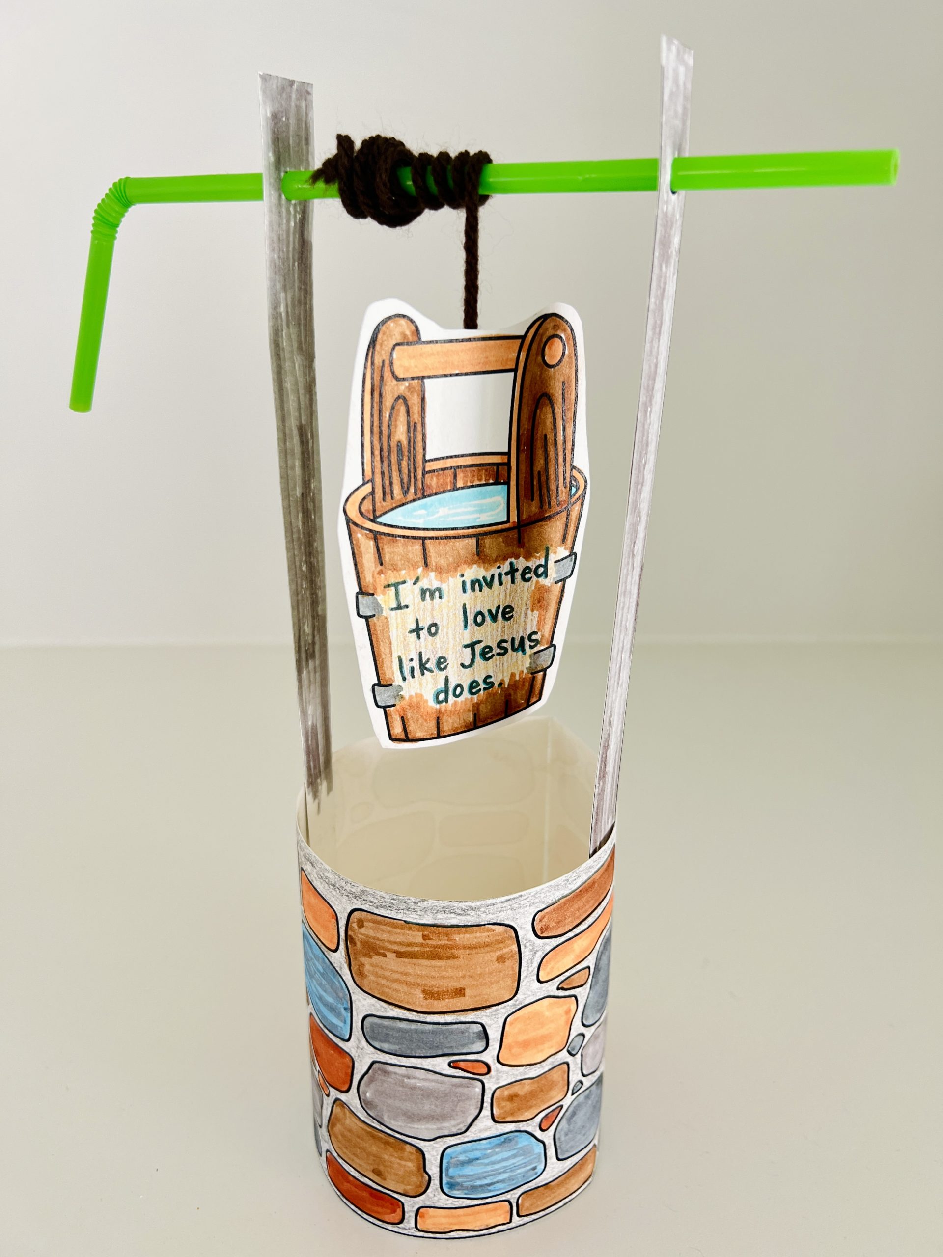 Weekly Challenge Instructions: To reinforce this lesson; Click Here to download the handout, then give your child a bendy straw, yarn, hole punchers, scissors, and tape. Cut out and assemble the pieces of the well and pail. Have them write a loving act they can do this week on the blank space of the pail. They can also write the Good to Know. Attach yarn to the back of the pail and attach the other end to the straw. Wind the bendy part of the straw to pull the pail up. See a worked example here.